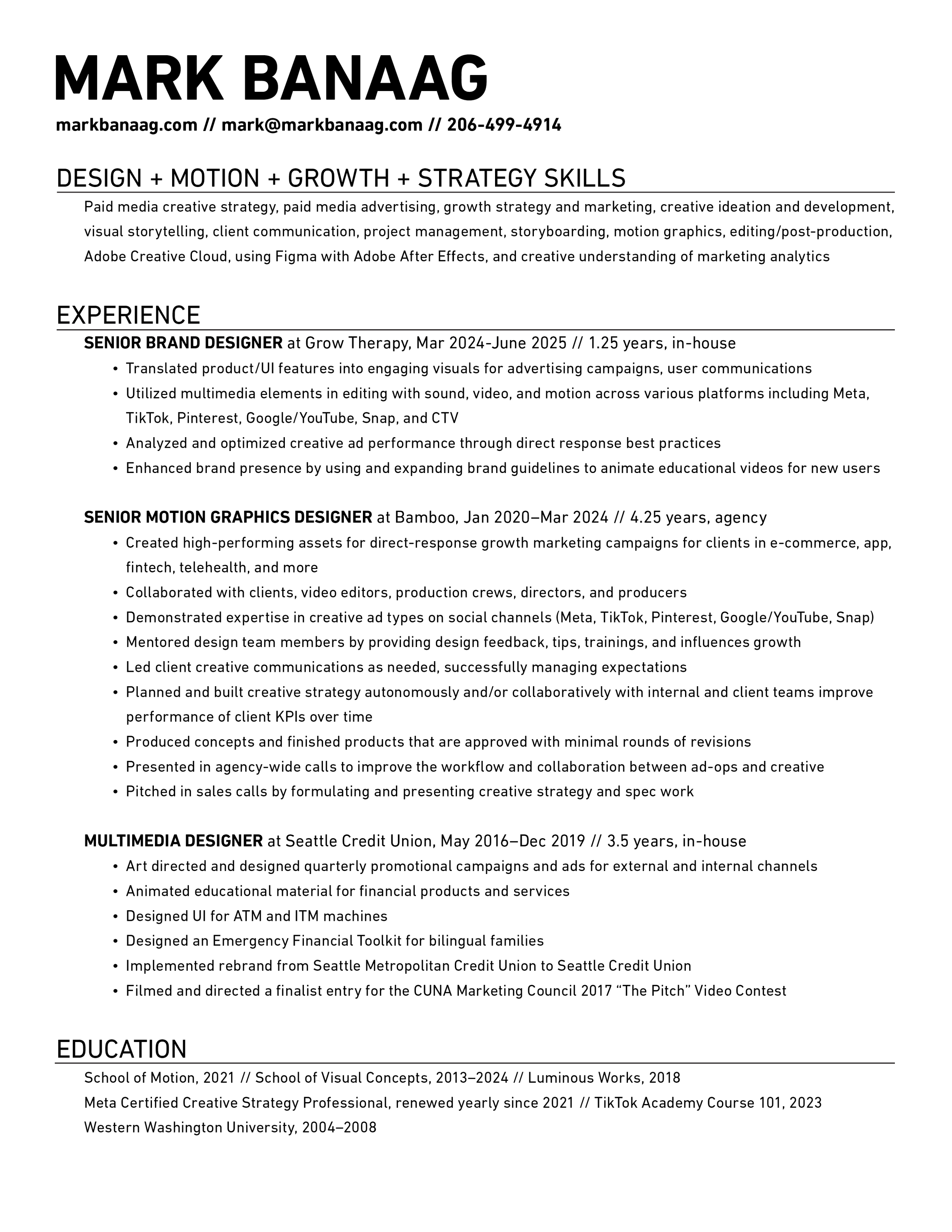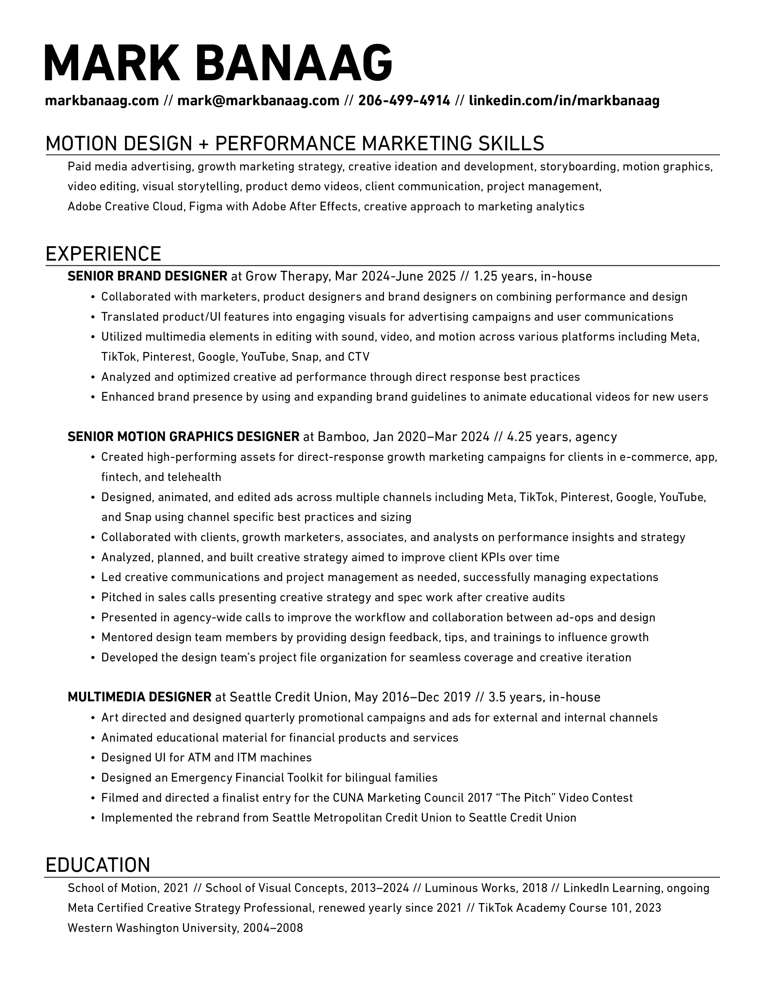 “I had the absolute pleasure of working with Mark for 3 years as his coach and colleague at Bamboo and I am delighted to give him my highest recommendation as a designer and collaborator. To say that Mark is an excellent motion designer with deep expertise in performance marketing is true, but only gives you part of the picture of what it’s like to work with him. He is the best kind of teammate: truly invested in the work, but also in the people he works with. Mark is a natural collaborator and communicator who elevates every project by asking the right questions. He is capable of seeing the big picture and finessing the details. In short, his hard and soft skills are off the charts. I would be overjoyed to work with Mark on anything.”