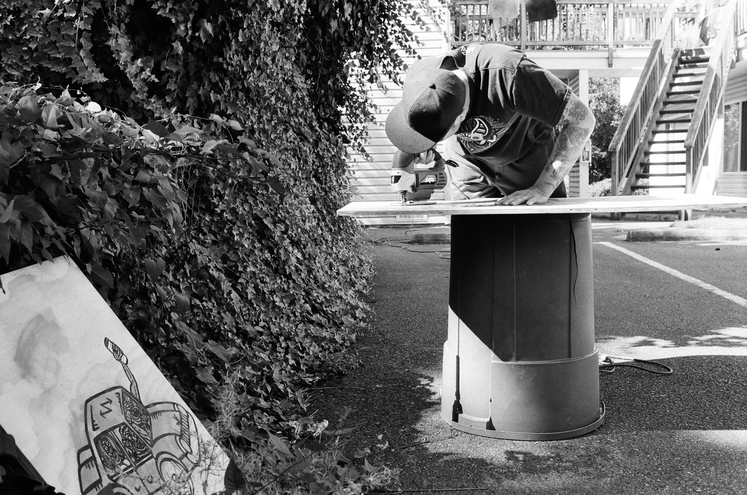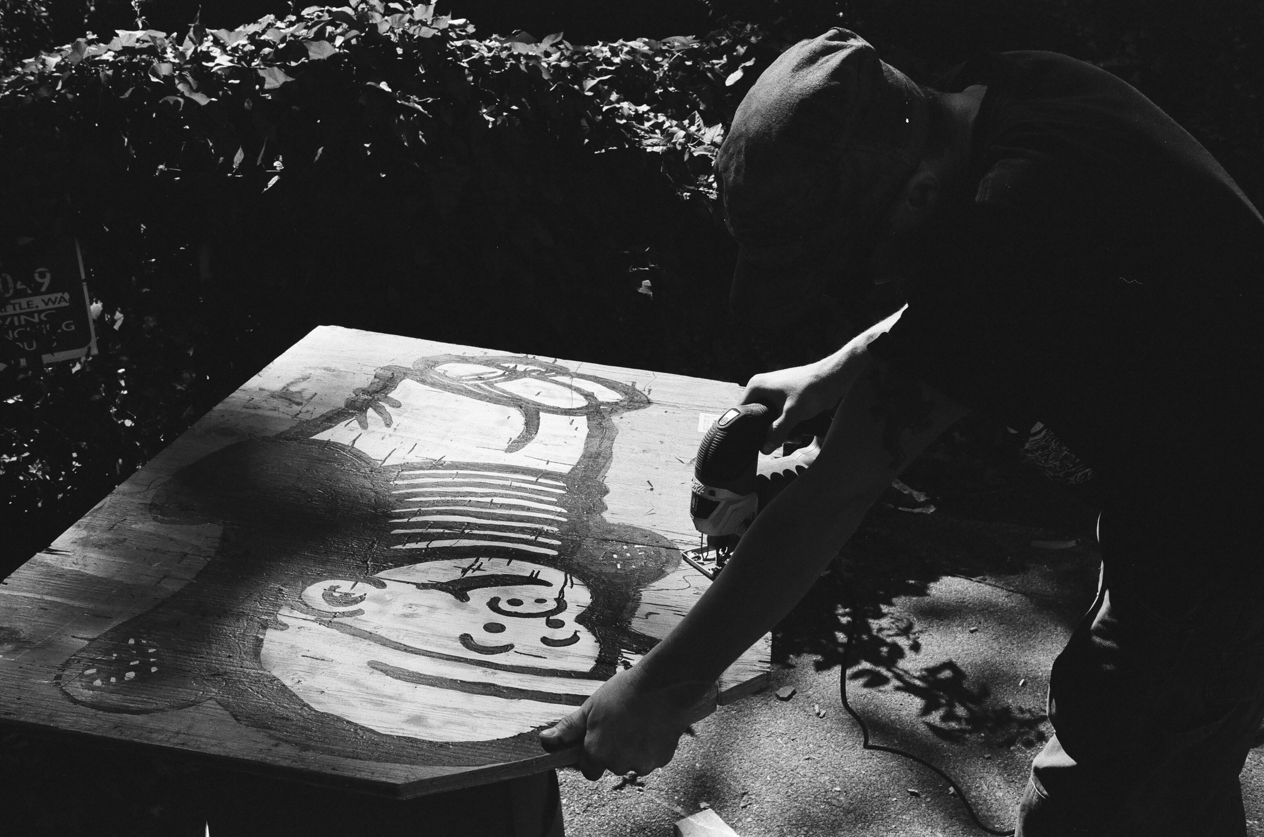 As I'm starting to shoot more photos again, I wanted to take photos of Zac working on his art. These days Zac has been working on wood and cutting it out.